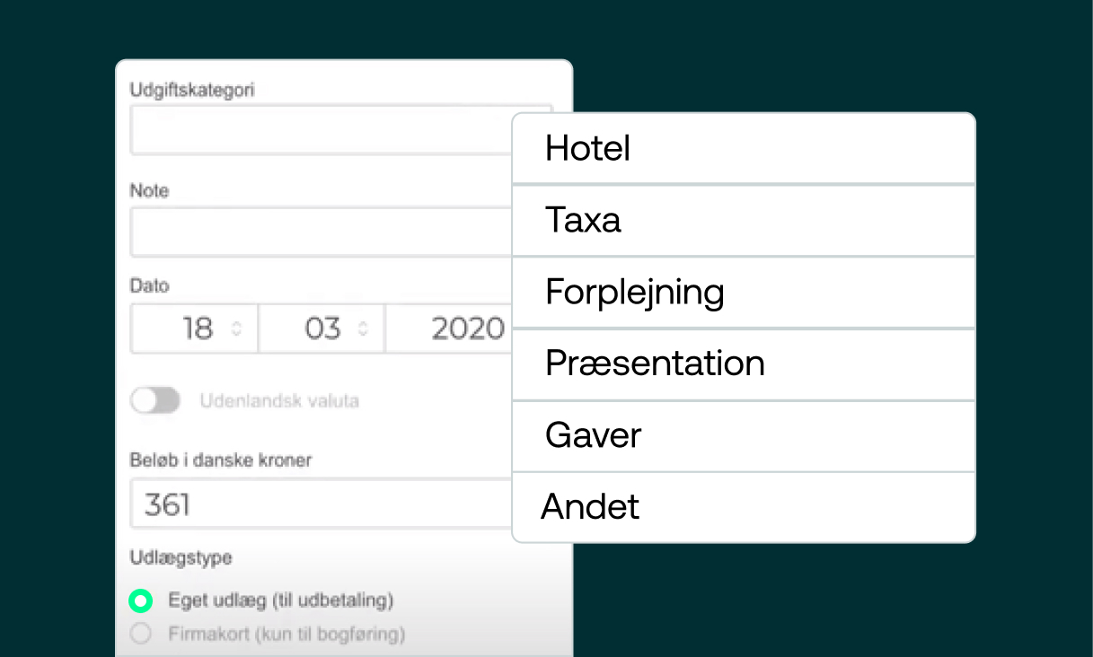 Vi har gjort det muligt at vælge hvor de forskellige udlægskategorier bogføres. Du kan selv oprette de kategorier du vil have og mappe dem til den bogføringskonto udlægget skal bogføres på, så alle udlæg lander pænt i regnskabet.